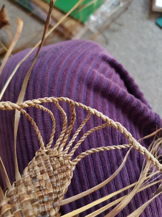 Louie Zalk-Neale: My art practice is led by tī kōuka – NZ cabbage tree – a taonga plant that’s treasured as a source of fibre, food and rongoā, and as a tohu in physical and intangible navigation. Pāraerae (sandals) are often made from tī kōuka because of the strength and durability of their leaf and fibre. I’ve made five pairs now, refining the process and using different techniques. The two pairs in the exhibition are made from boiled green leaves and fallen brown leaves, and the miro (string) lacings are also made from tī kōuka. The fibre extraction process is quite different to harakeke — it involves scraping the leaves against a board with a toki (adze) or anga (shell) to remove the flesh that holds the fibres together.