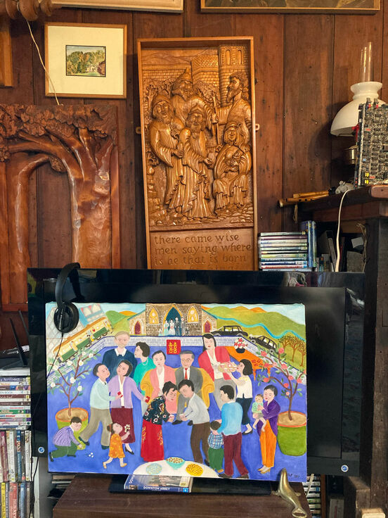 Painting by Wailin Elliott with a carving by her husband, Tom Elliott, above. Photograph by Kathryn Tsui.