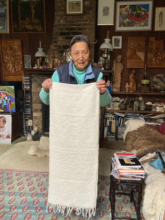 Wailin Elliott with her weaving. Photograph by Kathryn Tsui.