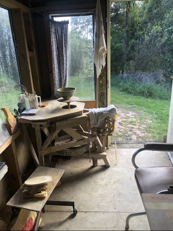 Wailin Elliott’s ceramics studio at Driving Creek Pottery which used to be Barry Brickell’s painting studio. Photograph by Wailin Elliott.