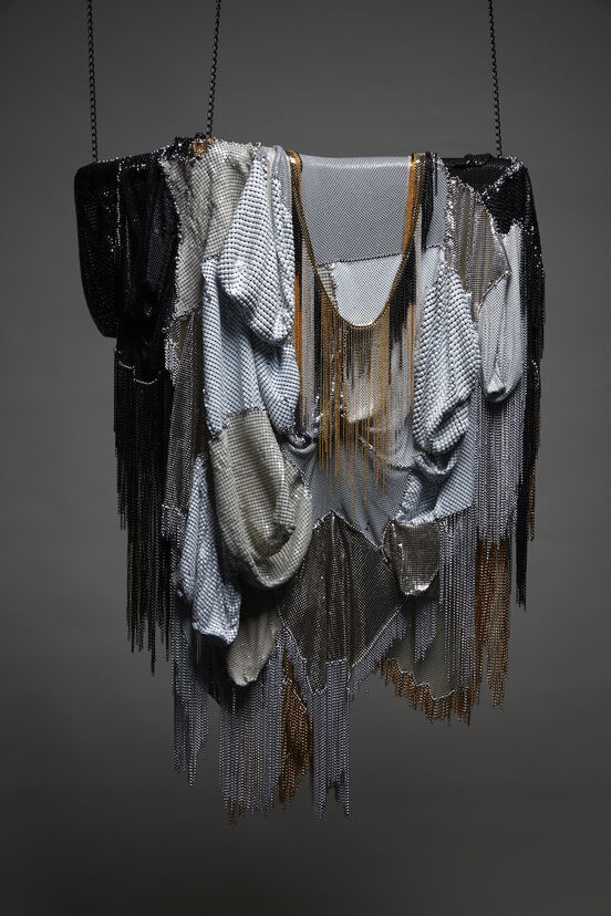 Scale and scope are playfully addressed by Schrijer, as the near- impossibility of an object’s proposed wearability and its material provenances are questioned within a framework that relies intimately upon the human body as its format. Line works as two aluminium spirals that are connected with a sterling silver necklace. The rod’s gradient converges with a cascading fringe of flattened anodised aluminium. The work surveys material excess, performing as a body- length hanging sculpture that offers a refreshing perspective on scale and balance. The space between our bodies is juxtaposed with materials that are acquired and consumed. This discordant thread of human intake is magnified further in Money Bags, which presents a disarray in the literal and metaphorical chains of habitual capitalist consumption. Executed mainly through recycled materials, Money Bags is composed of branded metal mesh coin purses, wallets and handbags. Schrijer playfully explores this historic alignment of workmanship and value through her use of a textile that is gesturally composed with associations of femininity and luxury.
