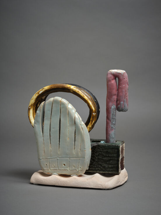 Central to the artist’s practice is a method of post-kiln assemblage. This format allows him to compose with pieces brought together from multiple firings that have occurred over substantial periods of time. Once selected, assembled and edited, this accumulation of components can be subjected to continuous making and unmaking. This approach is for Hawkesby a satisfactory and enjoyable way of working. It affords repeated revisions, akin to the rhythms of manual repair and unseen domestic toil – re-organising things, primping, puckering and gussying up, so all is orderly and presentable.