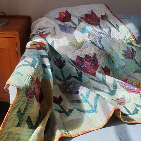 My mum Anne gave me this quilt, Indian Summer, about 10 days before the lockdown, but it’s almost as old as I am. It came to me as part of a clear-out of her considerable quilt stash from a lifetime of developing her craft. Initially made for display rather than use, Indian Summer spent many years on my aunt’s living room wall and is now faded enough to be relegated to the couch, and not too precious to worry about my new kittens chewing on the odd corner.