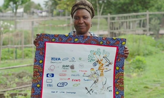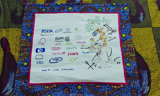 The stories Lema now tells through her embroidery involve guns and blood and severed limbs, crying babies and weeping mothers. All stitched delicately alongside the immediately recognisable logos of the world's largest tech companies. "In those logos, they have responsibility," she says.