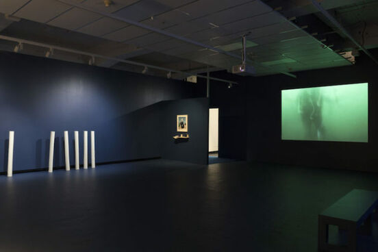 The Southern Cross Cable: A Tour, installation showing (L–R) The Long Walk to Northern Waters; The Southern Cross Cable: A Tour (publication); and a Power Troubles the Still, City Gallery Wellington, 2018.