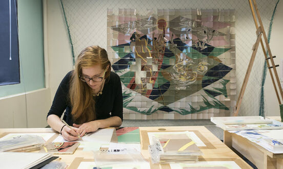 Bronwyn Holloway-Smith at work creating paintings of the 16 missing tiles in the Te-Ika-A-Māui mural. (Image: Courtesy Creature Design)