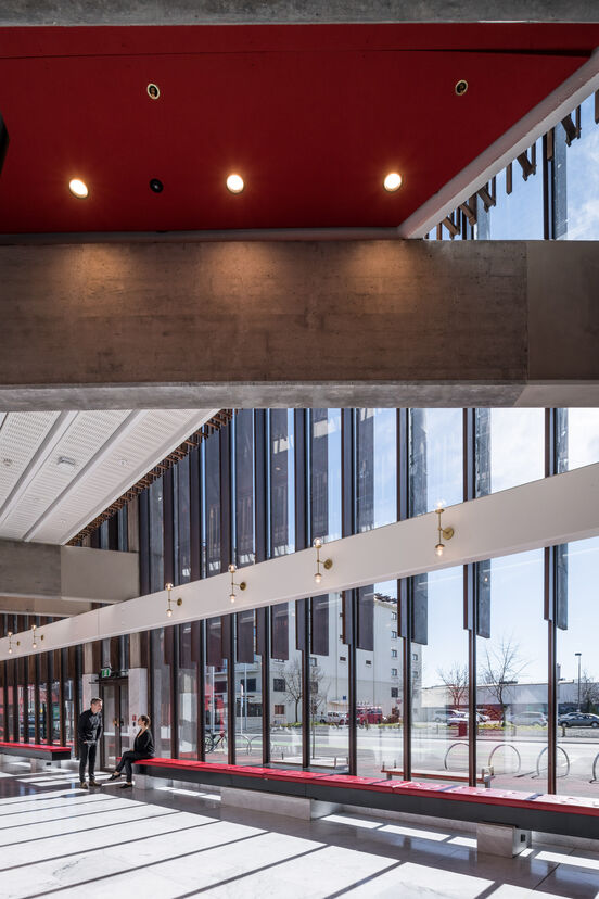 Concrete creates the conditions for the building's special acoustics. The two dedicated performance spaces of the Christchurch Town Hall, the auditorium and the James Hay Theatre, need to be acoustically separated from the noisy city they serve. The building's thick concrete walls, floors and ceilings are a means of creating sound-isolated interior spaces. It's incredibly efficient if the materials used for acoustic absorption and separation are also structural.