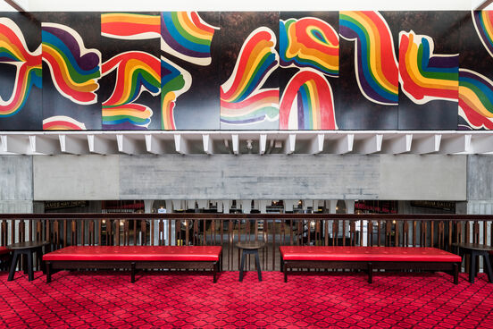 Designing contrasting architectural experiences within one building is key to Warren and Mahoney's work, and in the Town Hall this is not just provided by the materials. For example, the sense of compression at the main entrance, where doorways are low, contrasts with and emphasises the vast openness of the interior volume of the auditorium. The clarity of the plan and form of the building, and of the circulation from the foyer into the main performance spaces, contrasts with the layered visual complexity of the mezzanine floors and walkways suspended over and around the foyer. And the riotous colour and joy of Pat Hanly's commissioned painting Rainbow Pieces, visible through the windows, is heightened by the muted grey, brown, pink and blue tones of the exposed concrete that flanks the exterior of the foyer.