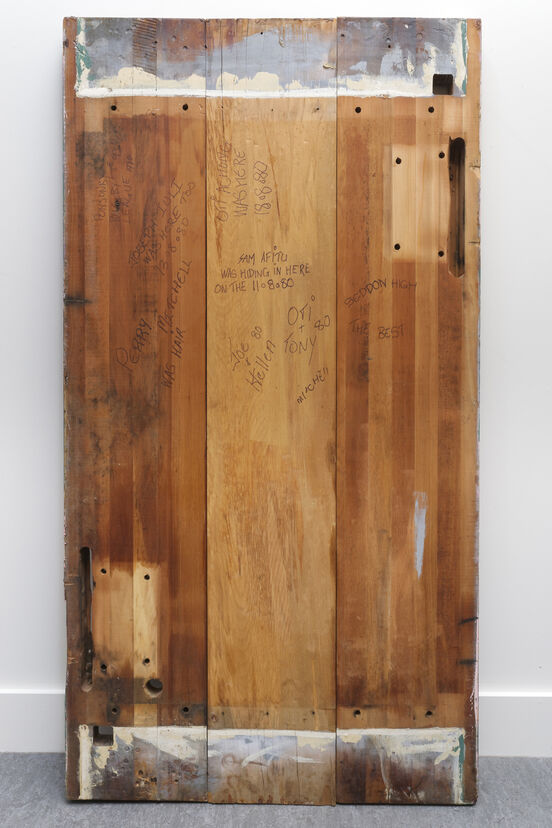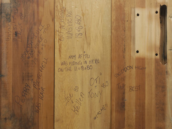 The old woodwork room was in use well into the 1990s, surviving a fire that damaged the trapdoor and led to a new floor being installed. The workshop was eventually demolished last year to make way for a new technology block, part of a major rebuild that replaced 80% of the classrooms. A grassy verge now marks the site of the original workshop, and the only remnants are three rimu planks of a workbench salvaged during the demolition by one of the art teachers. They’re now kept in the principal’s office. On the underside of the benches is an array of graffiti. It includes school pride (“Ponsonby Rugby League team 1980”) and a cluster of names: Sam Afitu, Joseph Iuli, Oti Achong, Perry Mitchell. Some are in pairs: couples? “Joe + Helen” and “Oti + Tony”. I’m told that there was also skinhead graffiti but it had recently been buffed off by a teacher.