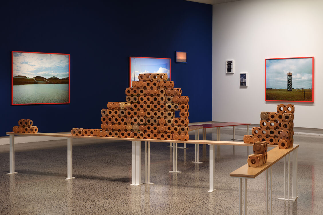 Installation view of Isobel Thom, Bricks, 2021 in Toro Whakaara: Responses to our built environment, with Ngahuia Harrison's ongoing series Coastal Cannibals in the background. Photograph by Samuel Hartnett.