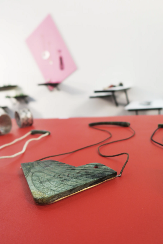 This year, third-year Whitireia Institute of Technology student Renee Pearson (taught under Peter Deckers) became the first New Zealander to win the Talente Prize in the stone category, for her series of fragmented cutlery forms carved from greywacke stone. In 2014 fellow New Zealvander Samantha Lewis took out the same prize for typography. Whitireia alumni Grace Yu Piper was also selected for the exhibition alongside Pearson with two pendant works carved from jade and greywacke, interweaving a pair of singular geometric forms. Lisa Walker and Karl Fritsch—both greatly celebrated in Munich, and students of Professor Otto Kunzli at the Munich Arts Academy in the early 2000s— were selected for the Schmuck exhibition. Walker for her 2015 Fischli and Weiss Bracelet, a bombastic circular form of interconnecting stiletto heels. It is a work that embodies an exuberant power, one that demonstrates little interest in arguments for or against any inherent material preciousness. Instead appropriating found materials for what curator Felicity Milburn describes as Walker “draw[ing] out the inherent contradictions of everyday life as she sees – and makes us see – the world in all its startling strangeness.” 1 With a not dissimilar prowess Fritsch’s work deceptively subverts traditional ideas of craftsmanship. His two rings, installed centrally in a large glass cabinet are off-beat and absurd. One, a wavering bullet shape of elongated synthetic ruby extends from a classical gold setting. On the other, Fritsch has inscribed in a loose script a droll personal message to the Schmuck selector.