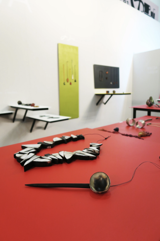 Catalysed by a funding opportunity through Creative New Zealand (New Zealand’s national arts development agency), this year Deckers returned with the exhibition IWA: New Zealand Makers. Developed to draw more directly on the dealer gallery environment of FRAME, the show focused on nine (iwa in Māori) jewellers spanning three generations of making. The exhibition design utilised vertical and horizontal surfaces with colour treatments responding to each artist, a technique frequently employed by Deckers in Handshake exhibitions. The presentation demonstrated a strong mix of high profile jewellers including Warwick Freeman, Alan Preston, Lisa Walker and Karl Fritsch; alongside Jane Dodd, Shelley Norton and Moniek Schrijer all of whom have been selected for Schmuck previously, Schrijer won the prestigious Herbert Hofmann prize in 2016. Three Hofmann prizes are awarded annually, selected from the Schmuck exhibition by an independent jury. The prize is esteemed in the jewellery community, creating exposure for winning jewellers that can lead to international dealer representation, exhibitions and residencies.