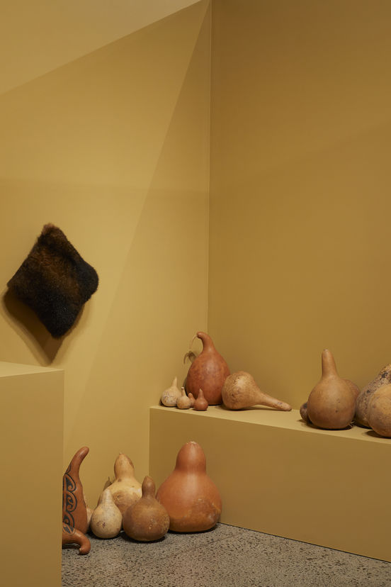 The photograph inspired Fritsch’s interest in hue, its horticulture and its use by Māori and Pākehā. In Māori culture, hue is personified by Hine-pū-te-hue, the goddess of peace who calmed conflict. Used for food storage, carrying water, rituals and as taonga pūoro (musical instruments), hue were objects of cultural and physical sustenance.