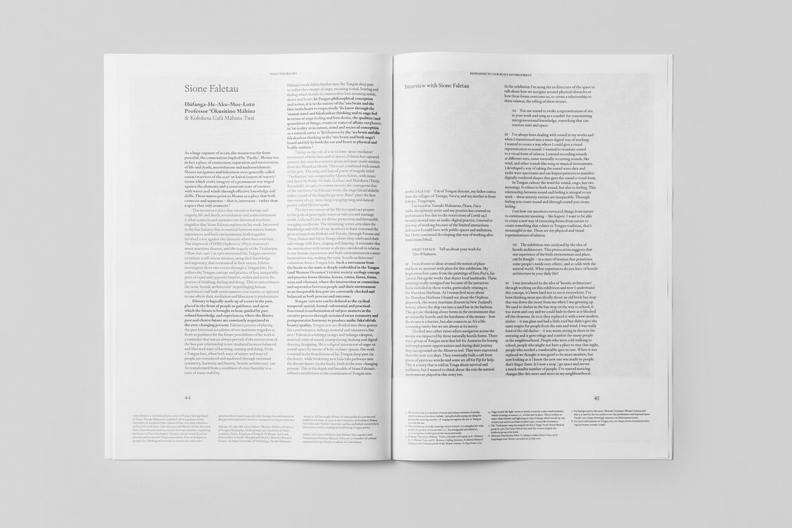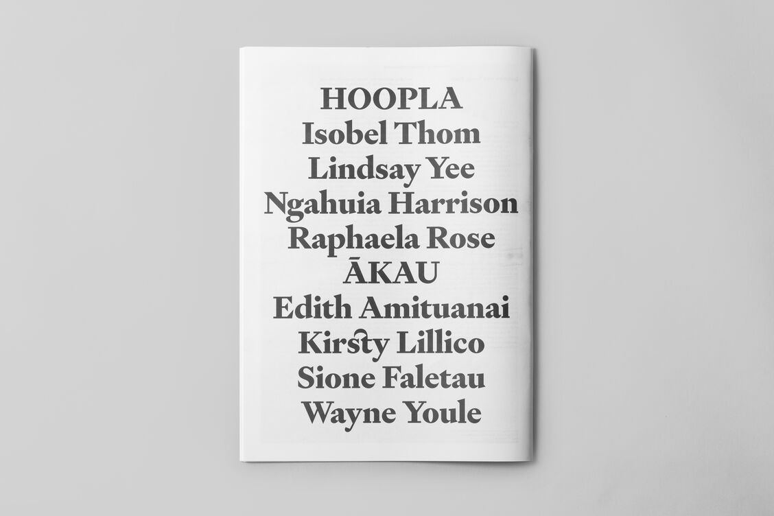 It features interviews with the ten practitioners involved in Toro Whakaara: HOOPLA, Isobel Thom, Lindsay Yee, Ngahuia Harrison, Raphaela Rose (at Objectspace) and ĀKAU, Edith Amituanai, Kirsty Lillico, Sione Faletau and Wayne Youle (at CoCA); and new writing on each of the projects exhibiting courtesy of Eu Jin Chua, Gradon Diprose, Gina Hochstein, Jade Kake, Rebecca Kiddle, Kate Linzey, Hūfanga-He-Ako-Moe-Lotu, Professor ‘Ōkusitino Mā & Kolokesa Uafā Māhina-Tuai, Felicity Milburn, K. Emma Ng and Icao Tiseli.