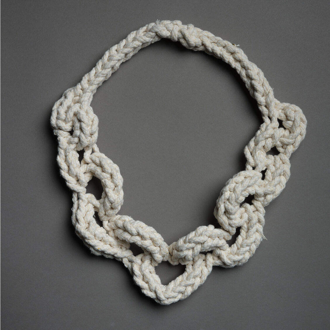 “Ever met an artist who can spirit the power of a material into its earthly opposite? Since 2015 Finn Ferrier has been a student of rope. He takes a given length of this hardy and utilitarian seafaring textile and conjures a vase, a lamp or a garland of exquisite knot making. Aficionado of the handmade and enthusiast of the objects we surround ourselves with in daily life. The incomparable Ferrier has made sixteen necklaces for Objectspace of indefatigable crafting. Adornment for knot lovers, tastemakers and sailors alike.” – Kim Paton