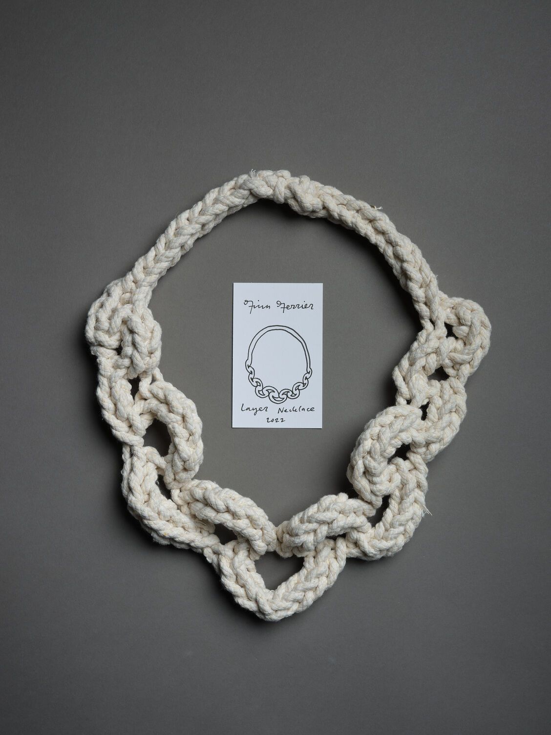“Ever met an artist who can spirit the power of a material into its earthly opposite? Since 2015 Finn Ferrier has been a student of rope. He takes a given length of this hardy and utilitarian seafaring textile and conjures a vase, a lamp or a garland of exquisite knot making. Aficionado of the handmade and enthusiast of the objects we surround ourselves with in daily life. The incomparable Ferrier has made sixteen necklaces for Objectspace of indefatigable crafting. Adornment for knot lovers, tastemakers and sailors alike.” – Kim Paton