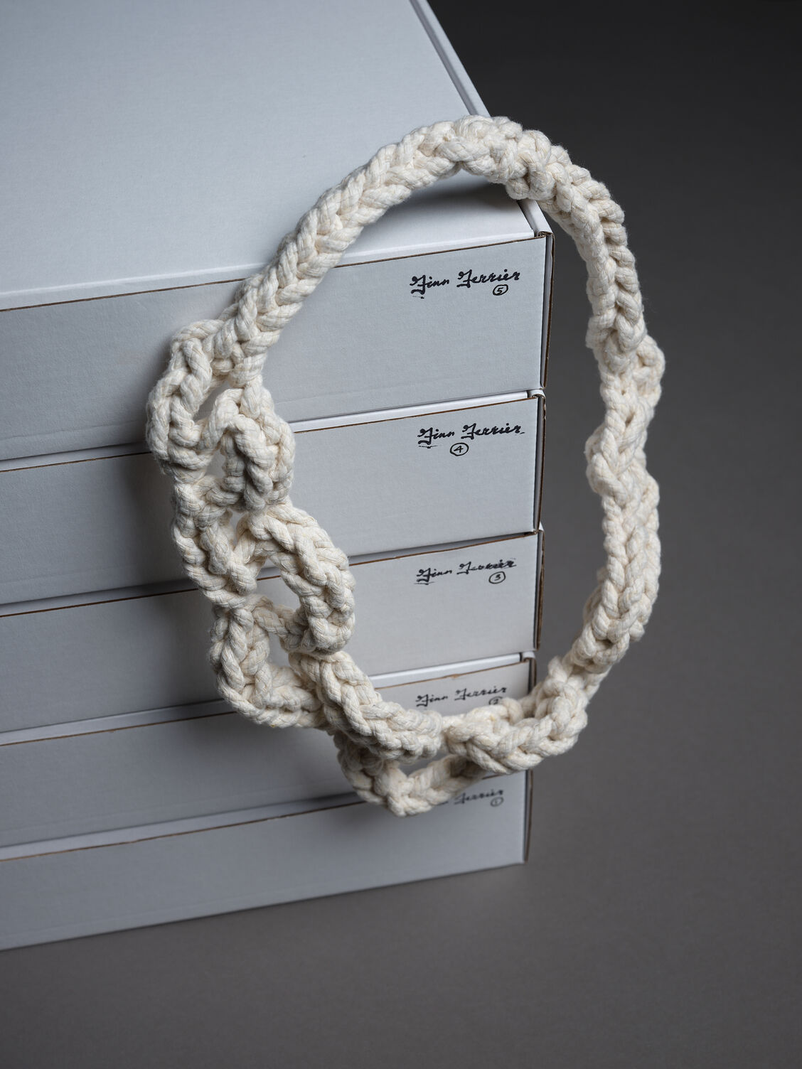 Ferrier has recently exhibited at Te Uru, The Sarjeant Gallery and The New Zealand Maritime Museum. His work is in public and private collections in Aotearoa. For Objectspace, Ferrier has created a series of rope garlands intended to be worn. These works are the logical progression of decorative knot work, reimagined as adornment.