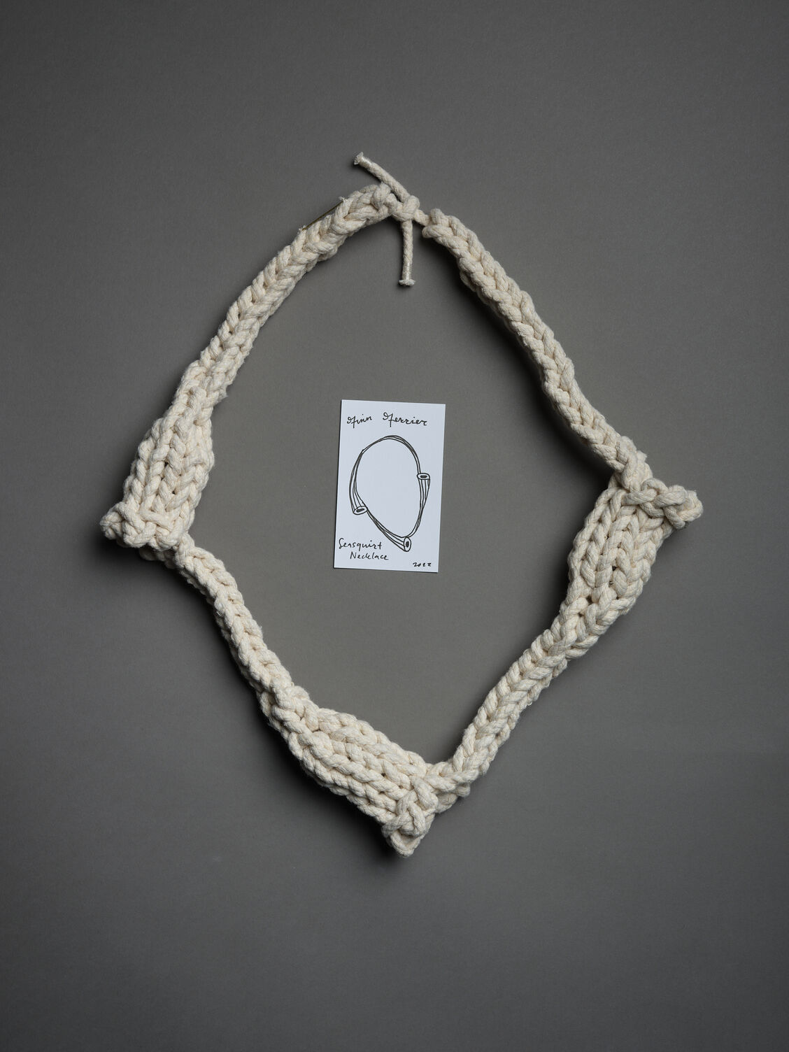 “Ever met an artist who can spirit the power of a material into its earthly opposite? Since 2015 Finn Ferrier has been a student of rope. He takes a given length of this hardy and utilitarian seafaring textile and conjures a vase, a lamp or a garland of exquisite knot making. Aficionado of the handmade and enthusiast of the objects we surround ourselves with in daily life. The incomparable Ferrier has made sixteen necklaces for Objectspace of indefatigable crafting. Adornment for knot lovers, tastemakers and sailors alike.” – Kim Paton