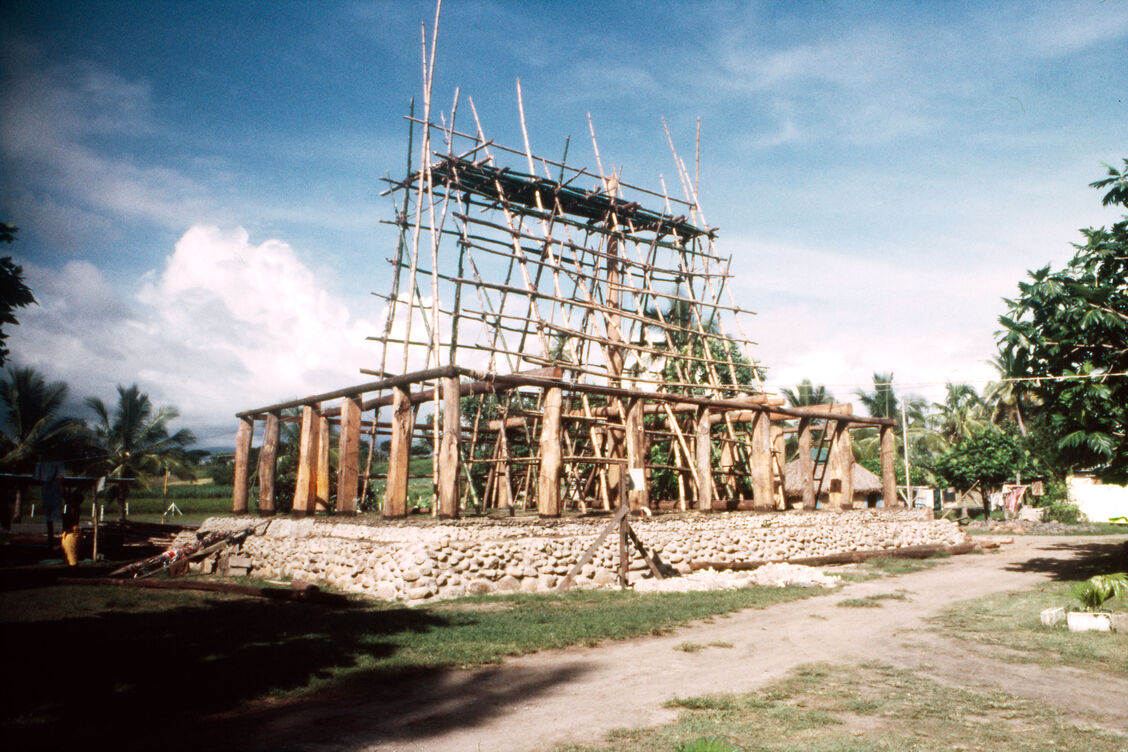 From the photographic archive of Dr Mike Austin, this photograph features a bure mid construction. The scaffolding stabalises the main central posts of this house, pictured here mid-constuction with one post in place and another to be installed. Perimeter posts are constructed to support the rest of the roof structure. The generous raised platform will complete this bure-style house when finished.