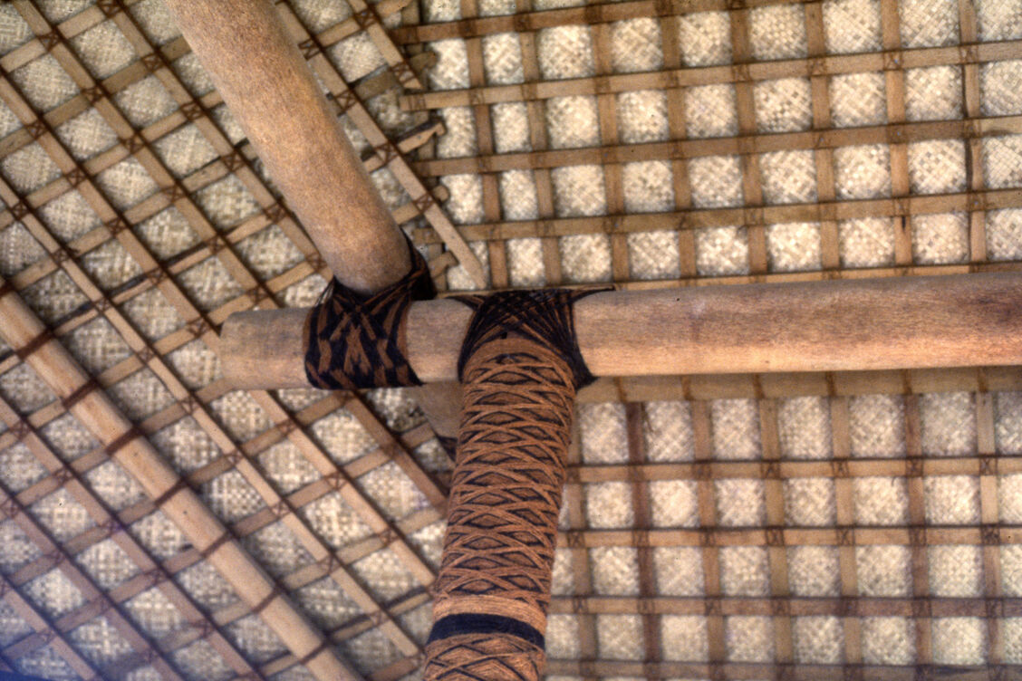 From the photographic archive of Dr Mike Austin, this photograph features lalava lashing with kafa (sennit) on beams. Woven mats are placed between the purlins and the roofing materials.