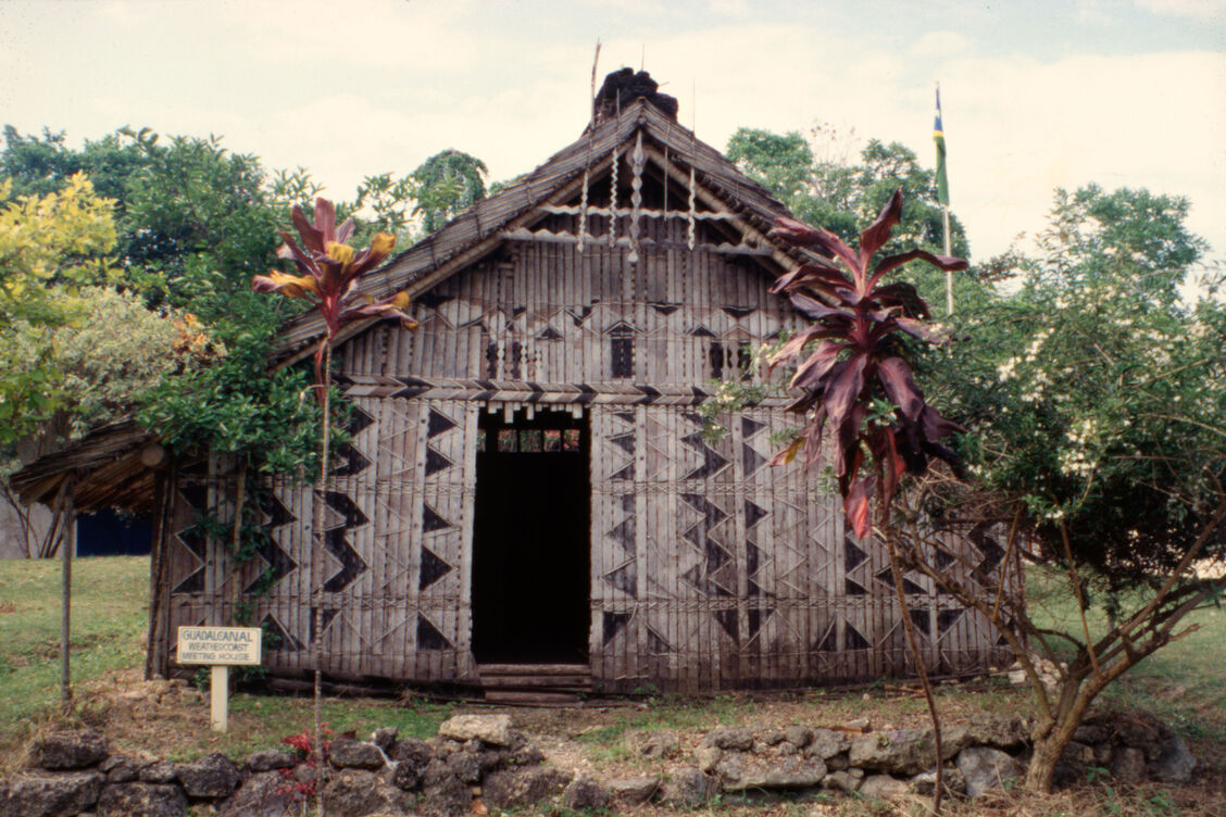 From the photographic archive of Dr Mike Austin, this photograph features one of several houses in a museum collection in Honiara, the capital and largest city of the Solomon Islands. This house is built to be indicative of traditional architecture in Guadalcanal, the principal island in Guadalcanal Province of the Solomon Islands.