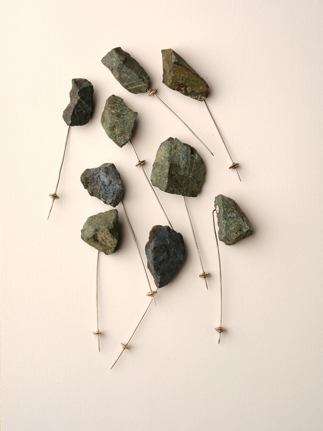 For Objectspace, we have 25 of Preston’s Road Works Pins, not made for us as such, much better than that... discovered on a studio visit amidst his glorious collection high up on his Muriwai maunga. Made since 2001, these brooches chronicle Preston’s enduring connection with the rock found underfoot. In this case the humble chips of greywacke that form our weaving map of roads.