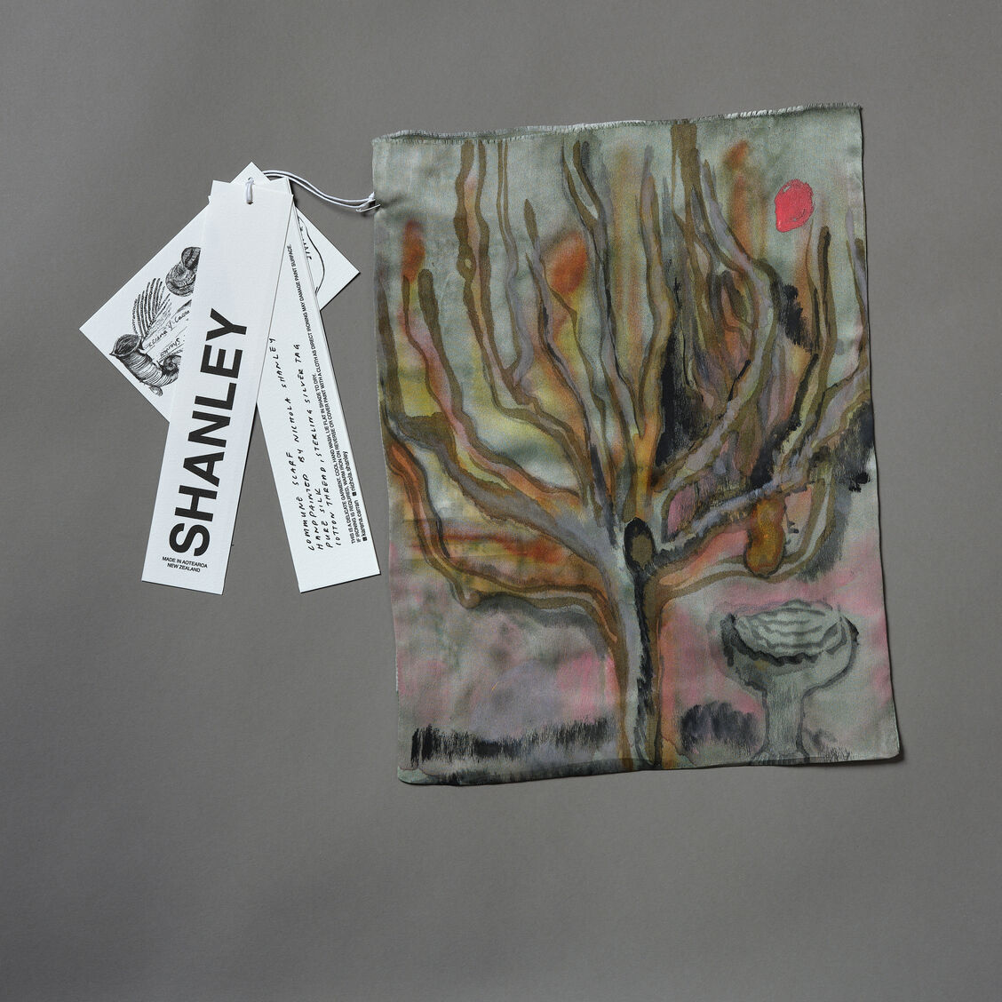 The collaboration between Shanley and the label Kārena/Carran has grown from a friendship formed in Ōtepoti. These scarves are a small part of a wider body of work that continues to unfold; posted back and forth between Portobello and Lyttelton. With many years as solo practicing artists the two find great satisfaction in communication and in the knowledge some ideas need more than one personality in order to exist.